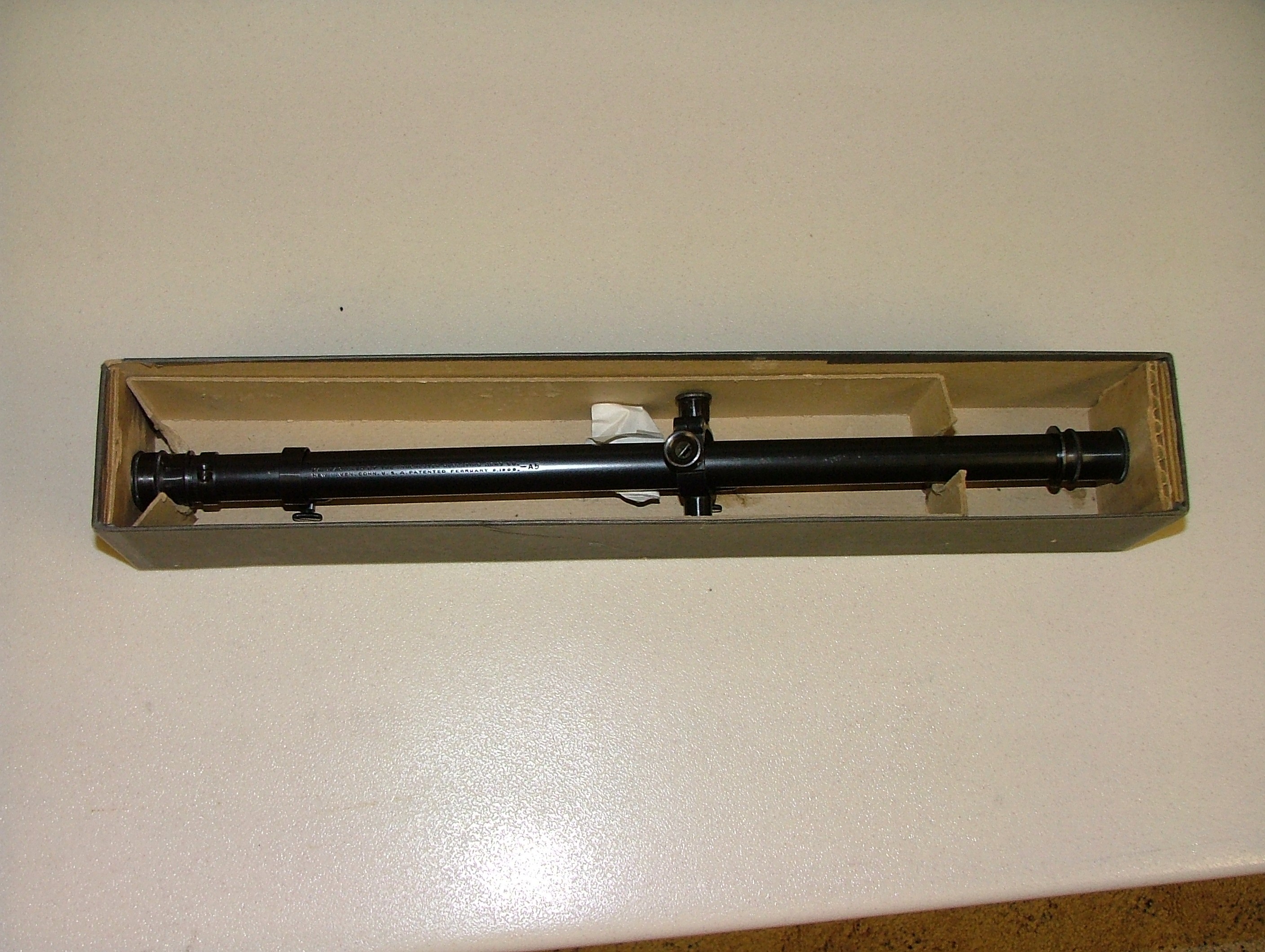 OfflineHere is a real nice one, in its original box. No plans to sell it. Boxed A5’s are very hard to fund. The scope I have for sale is almost as nice as this one and is currently on top of my 1927 M52. I don’t think $1,000 for a 98% and 100% original is too far out. A collector may pay that, but someone that just has to have a A5 for whatever purpose may well be happy with less than a 100% original. I am a collector, and would not even consider a A5 with 5A mounts. The beauty of the scope is the Grasshopper mounts. Big Larry