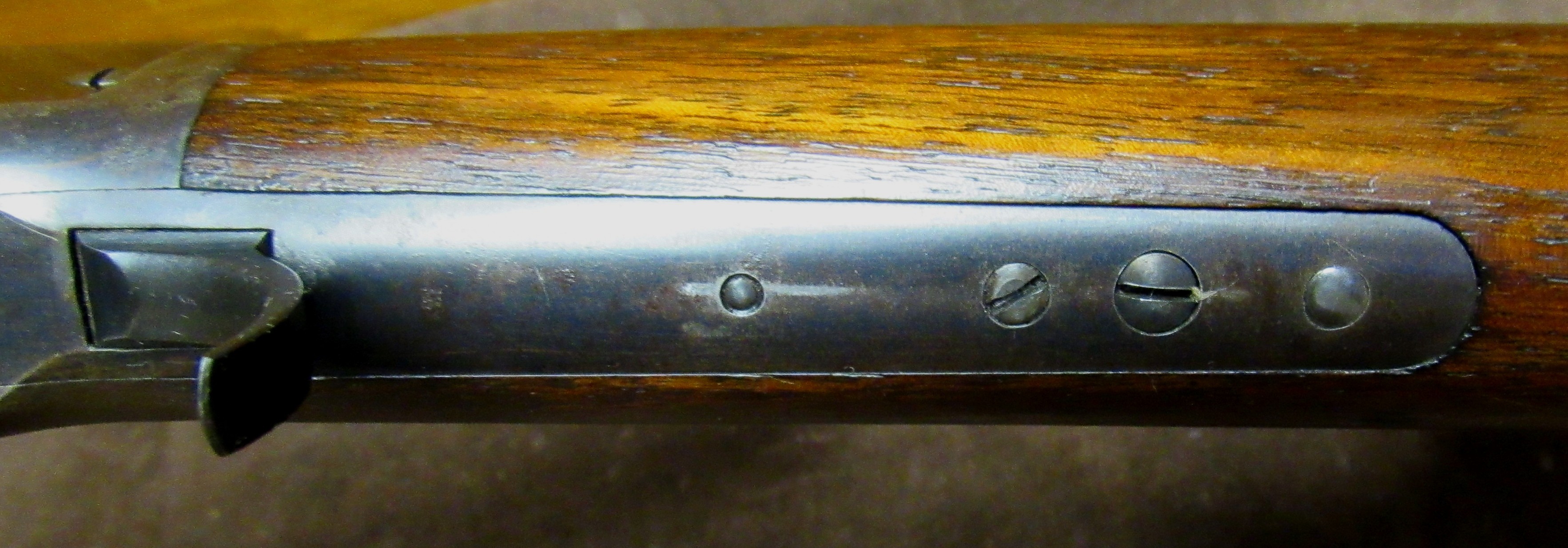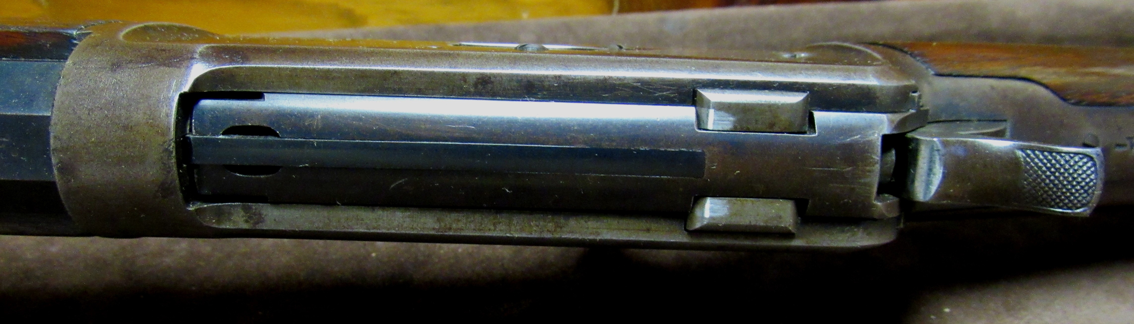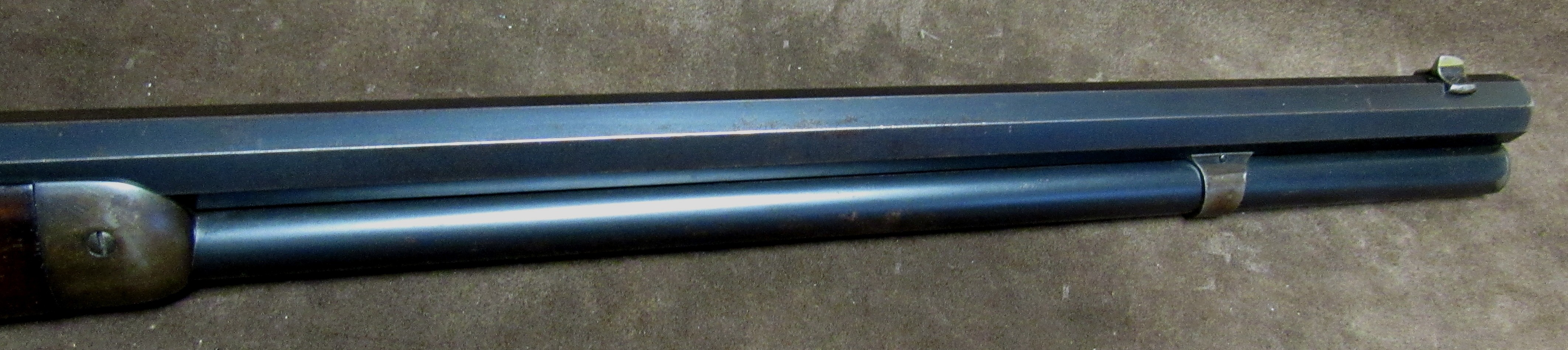 About 80 – 90% barrel and mag tube blue with the receiver having about 50% bluish brown finish remaining. Standard Winchester rifle configuration with crescent steel butt plate, full length magazine, standard sights and steel fore end cap. Perfect bore.