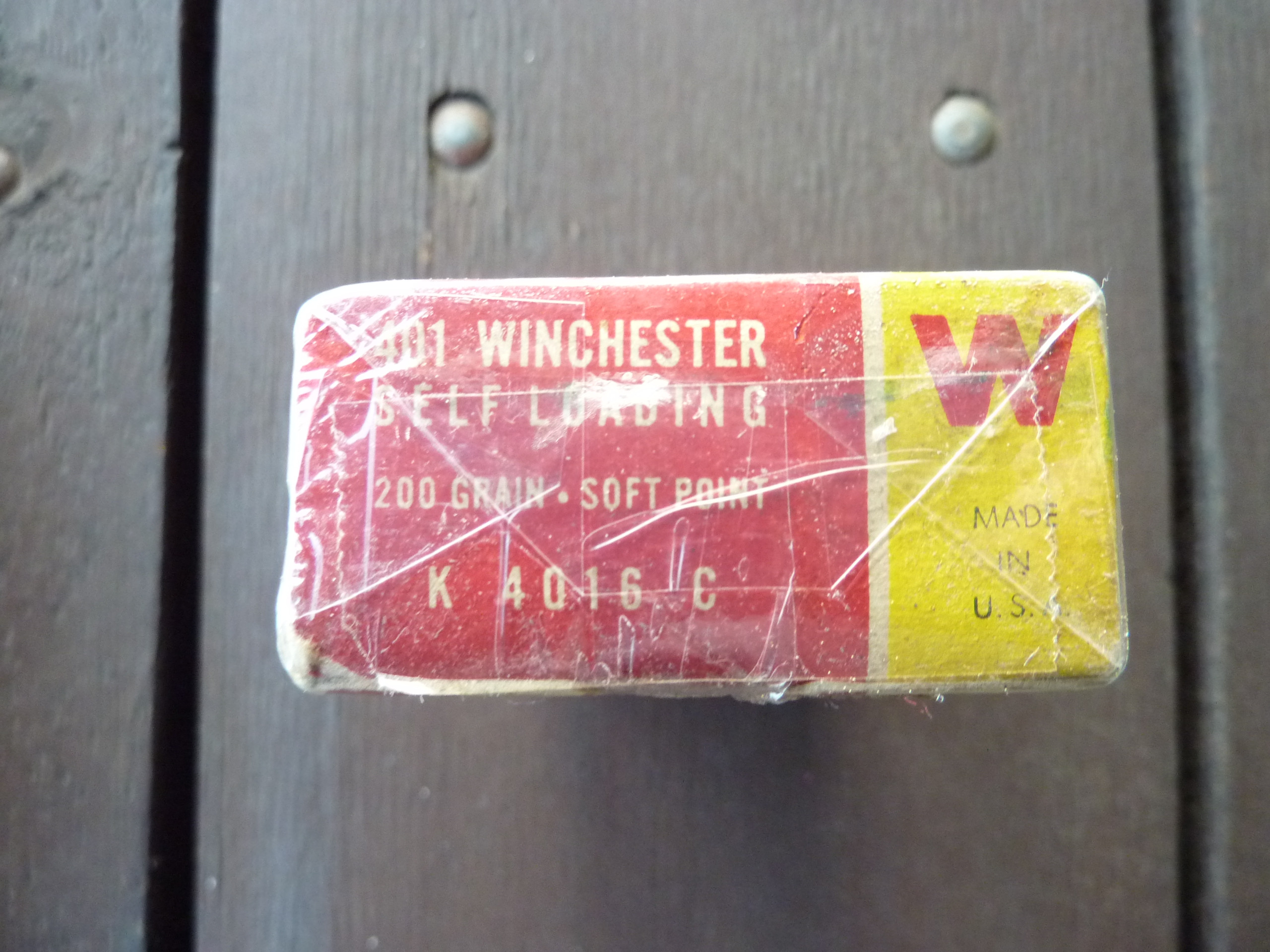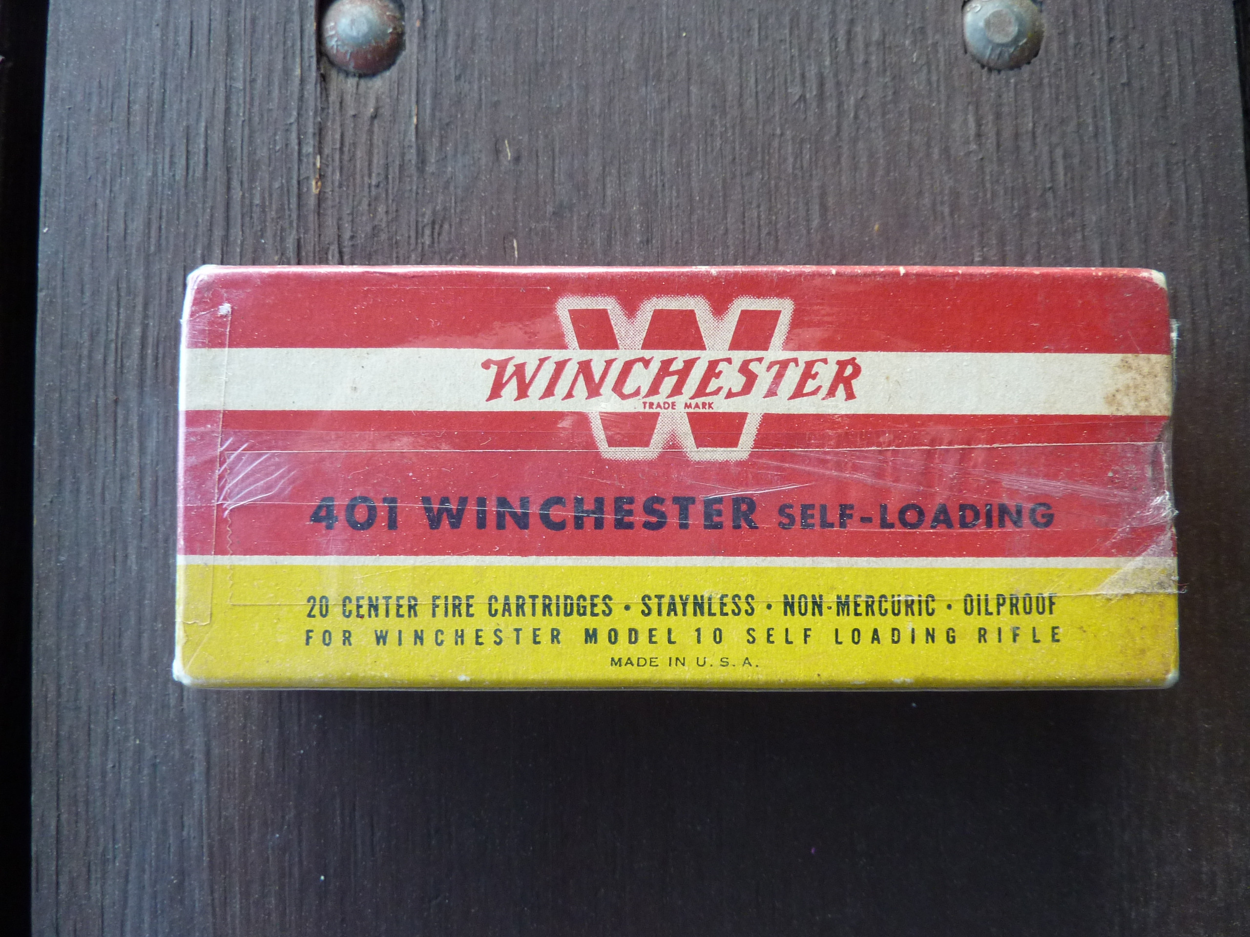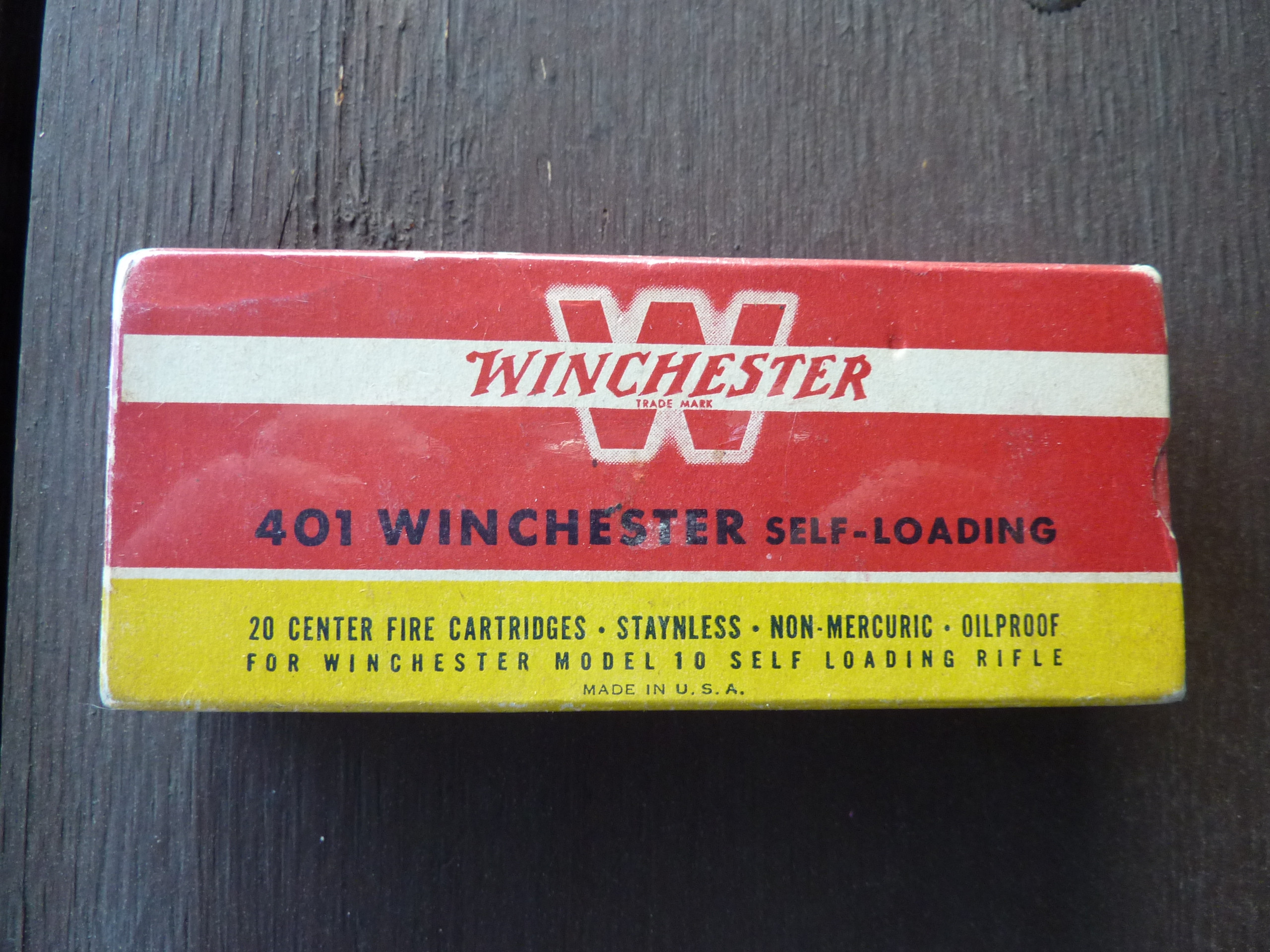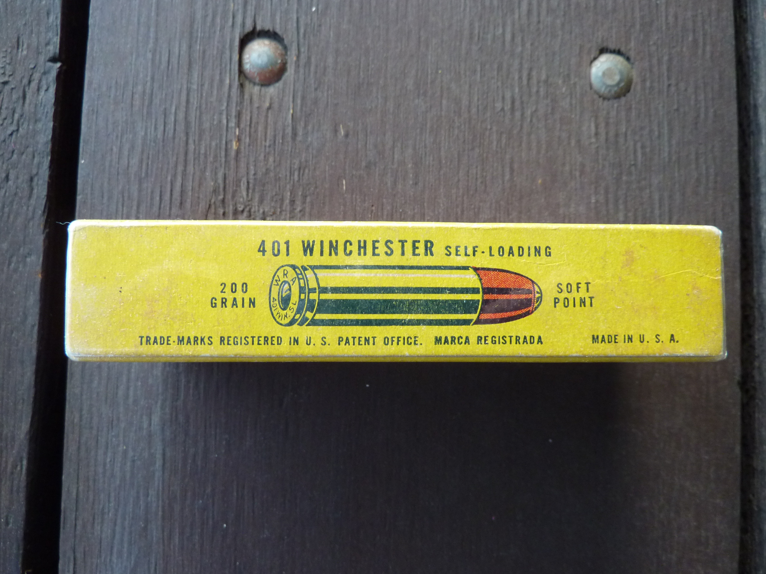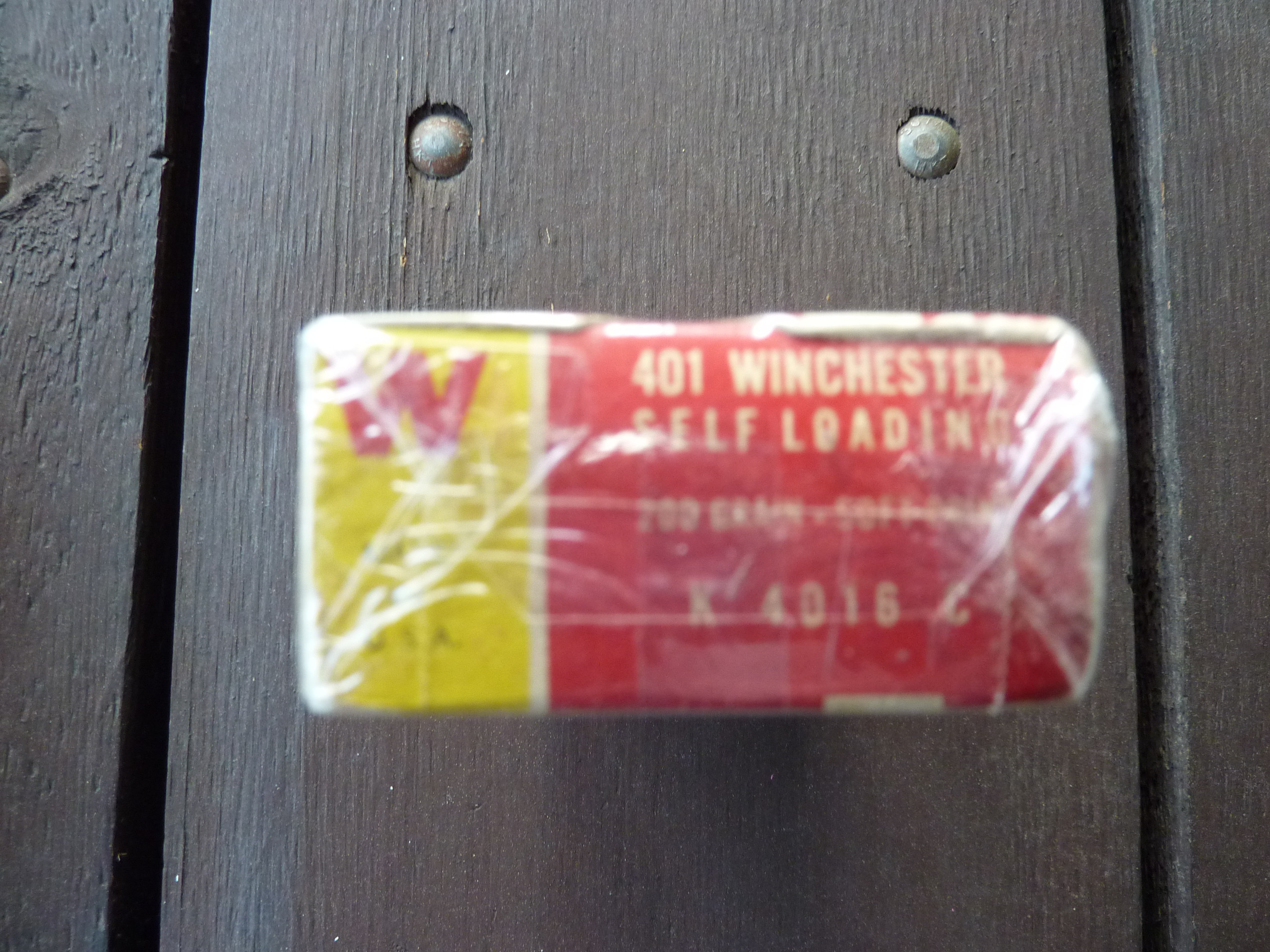 OfflineSelling vintage full box (20 rounds) Winchester red, yellow, white box 401 Winchester Self-Loading ammo (200 grain soft point). Ammo is factory original and in excellent condition and native to the box. Box is sealed in protective plastic wrap and in excellent condition. I took photos of all sides of the box. Asking $150 shipped. Please send me a PM if interested.