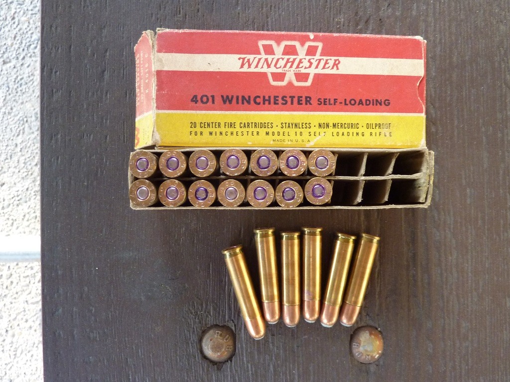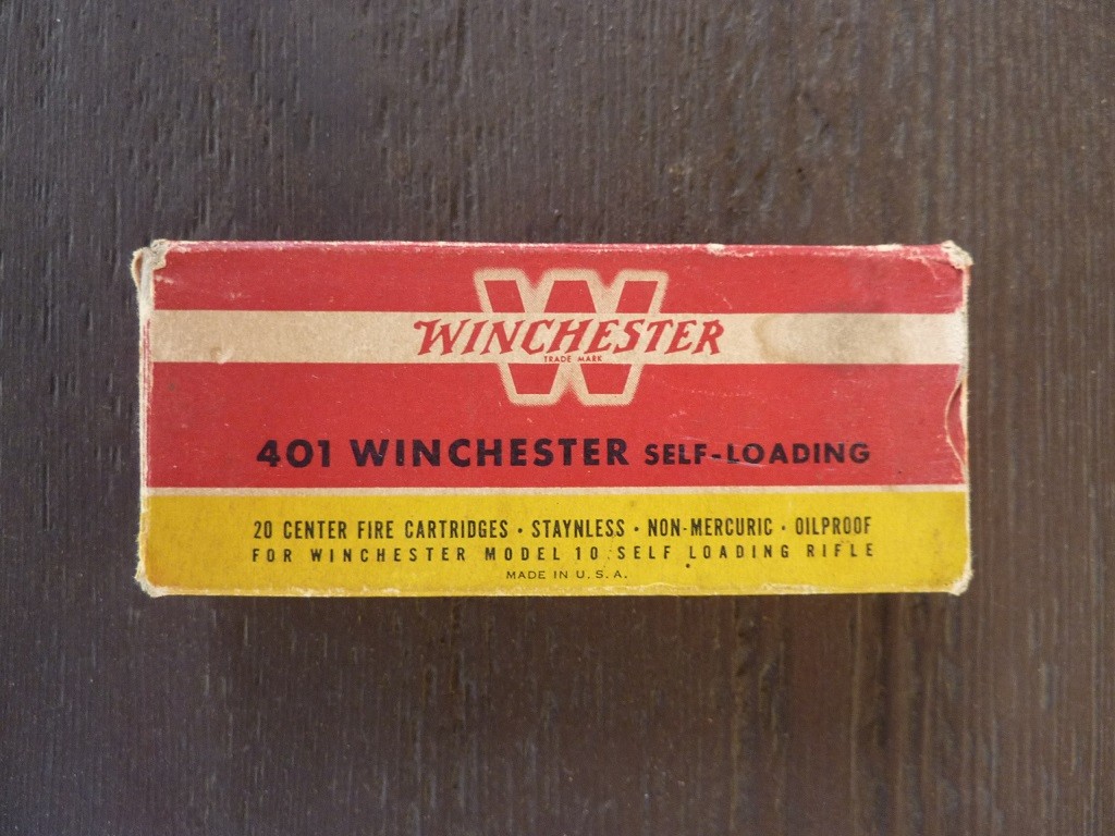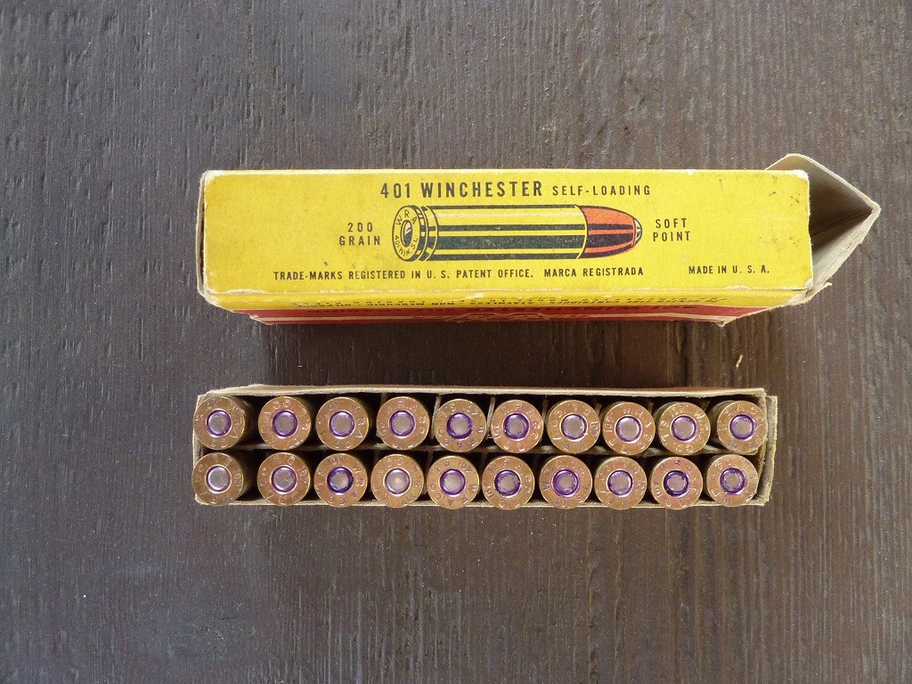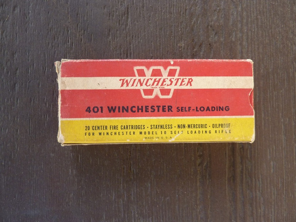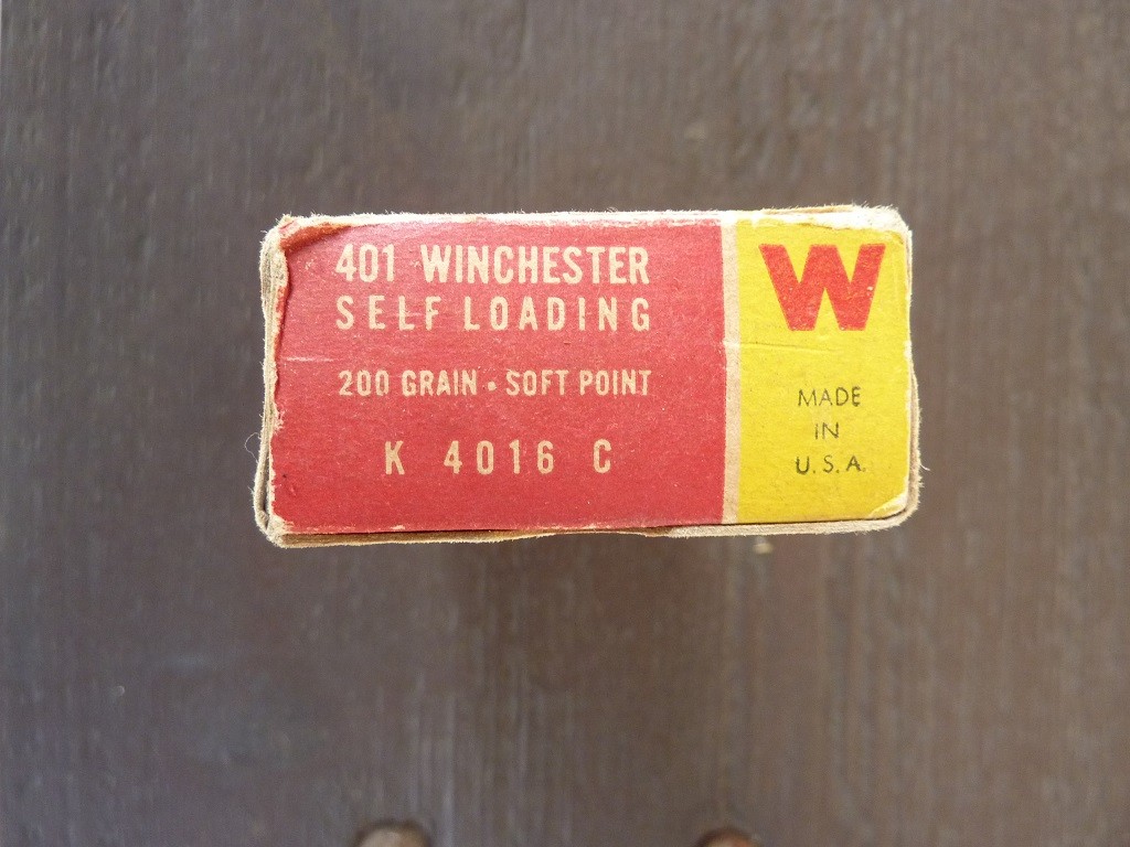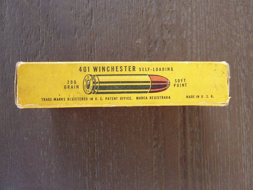 OfflineSelling vintage full box (20 rounds) Winchester red, yellow, white box 401 Winchester Self-Loading ammo (200 grain soft point). Ammo is factory original and in excellent condition and native to the box. Box is sound with wear and all internal end flaps are missing. I took photos of all sides of the box. Asking $100 shipped. Please send me a PM if interested.