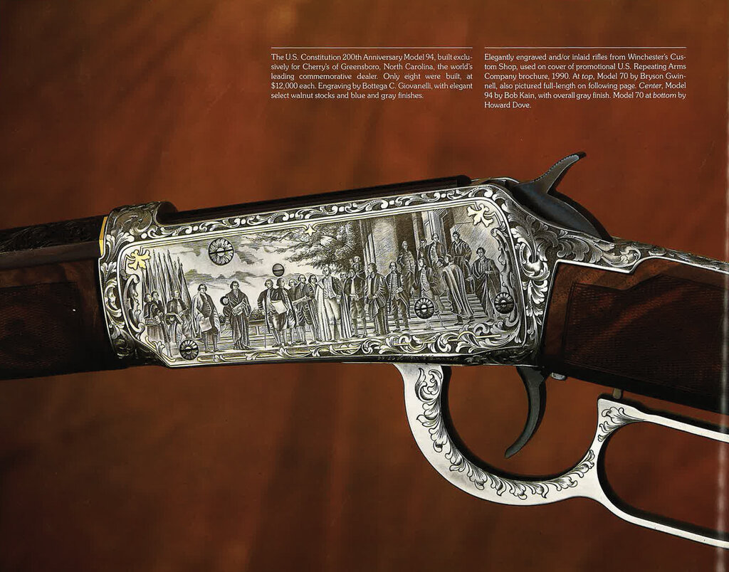 Fair enough, but to be clear the Winchesters in this thread were not engraved by machine and were made by the same Winchester Repeating Arms Co. New Haven, Conn. U.S.A. you wish to buy fromš They are quality firearms and just like the Pre 64 collectors no one cares if it has been fired. We all care if they have been abused. The value of both the Commemoratives and Pre64ās goes up or down based upon the condition. Show me an 1894 from 1895 with 90% blue vs 10% blue left and watch the value swing by a wide margin. You are correct on the Commemoratives, the boxes are part of the value but that is by design. However, if you are honest how much more would the value of that model 1894 mfg in 1895 be if it came with an original box and papers? I would wager more than any Commemorative box brings by a large margin š Finally my friend, many of the Commemoratives were hand engraved by the very famous Cesare Giovanelli. Even better, how about one of our own āPauline Muerrleā who hand engraved the very famous commemorative the āTies that bindā! An incredible 1 of 14 beauty! Iāve attached a picture of the Constitution Giovanelli engraved and it is stunning. She is a 1 of 17 and each one has a specific state on it, so one might say it is really a 1 of 1 as each are thus unique! Iām just not sure I can believe anyone wouldnāt want that beauty in their collection but as you said to each their own! I find joy in all of them and a few Colts!Ā